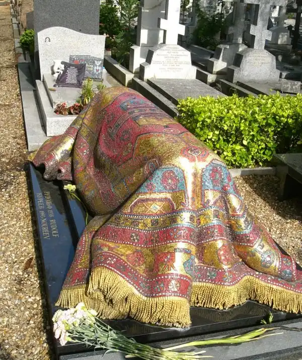 Очень необычное надгробие можно встретить под Парижем на русском кладбище Сен-Женевьев де Буа. В могиле, покрытой ярким мозаичным ковром, выполненным в восточном стиле, покоится всемирно известный артист балета Рудольф Нуреев. После смерти танцора в 1993 году его друзья решили сделать ему столь необычный памятник, так как при жизни Нуреев коллекционировал старинные ковры и текстиль. Памятник повторяет один из любимых ковров артиста и выглядит очень реалистично, особенно с расстояния в несколько метров.