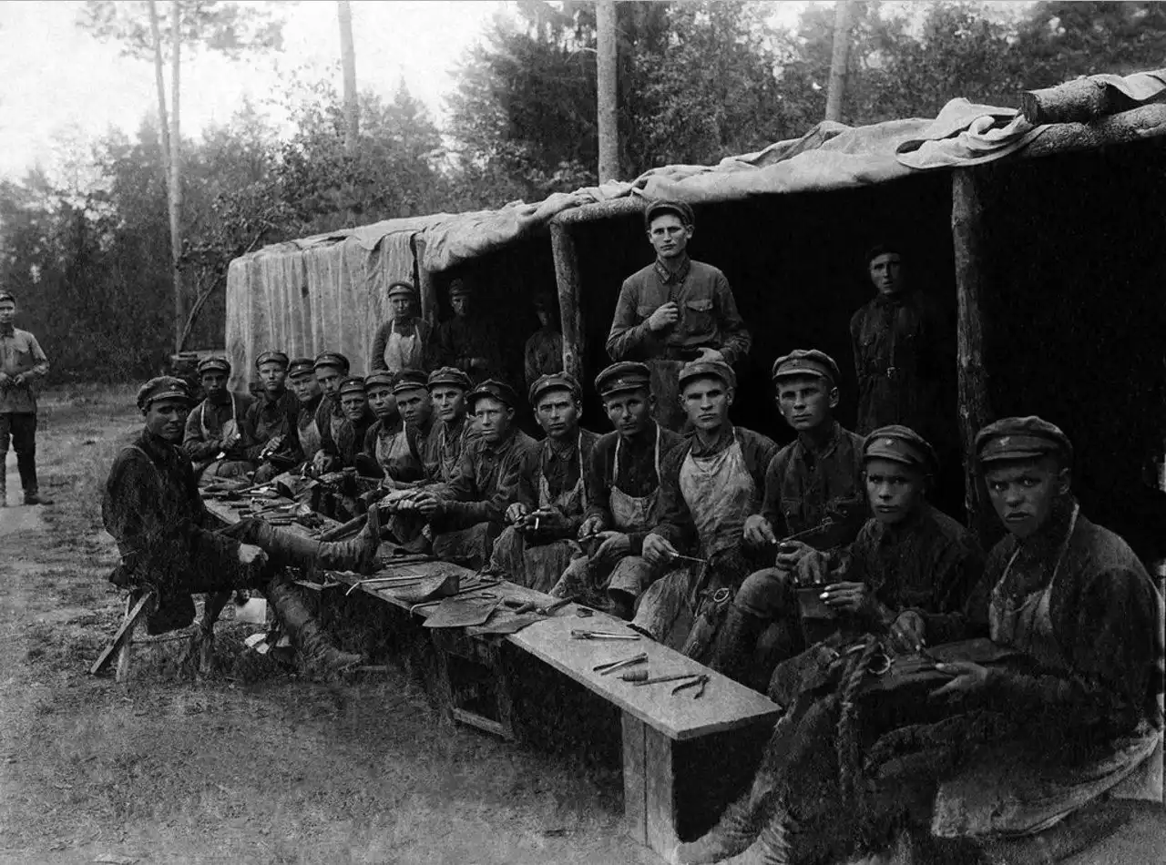 Красноармейцы овладевают мастерством сапожника и шорника. 1930-е.