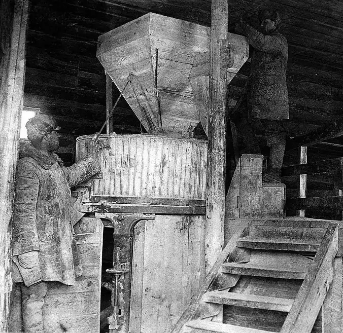 Магнитогорск. Мельница сельскохозяйственной артели. Конструкторы – спецпереселенцы братья Курочкины. Пропускная способность мельницы 600 пудов зерна. 1930-е.