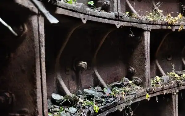 В средней части спуска нагромождение гнутых швеллеров — обрушенные конструкции
