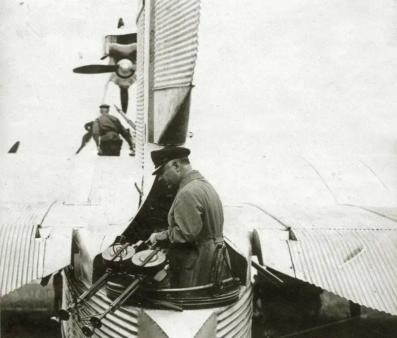 Председатель Реввоенсовета СССР К.Е. Ворошилов осматривает пулемётную спарку ДА-2, размещённую в кормовой огневой точке бомбардировщика ТБ-4; сентябрь 1933-го года