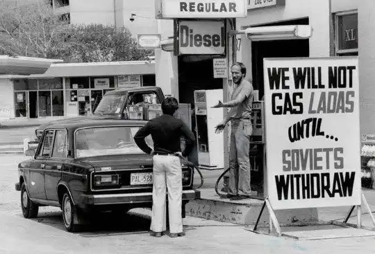 Водителю "Лады" отказывают в бензине по причине ввода советских войск в Афганистан. Торонто, 1984