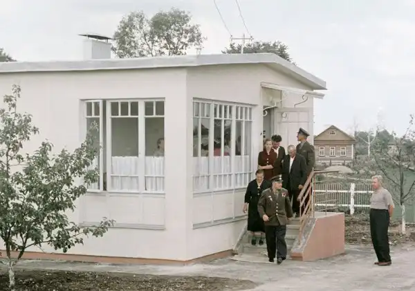 Снимок интересен совершенно нетипичным для России обликом индивидуального дома. Больше напоминает какую-нибудь веранду в пионерском лагере или гостевой домик в автокемпинге. Понятно, что это казённая постройка для родителей героя, но всё равно удивляет, что не могли построить что-нибудь в традиционном стиле.