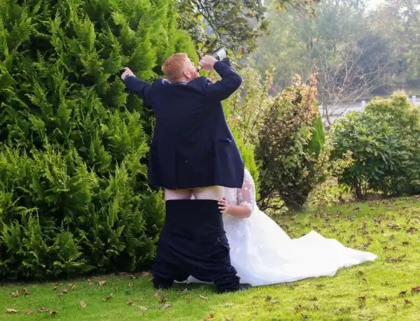 Именно так и решили молодожены Тони и Гаррет Фергюсоны , когда заказывали фотосессию у фотографа. Будет что внукам на старости показать.