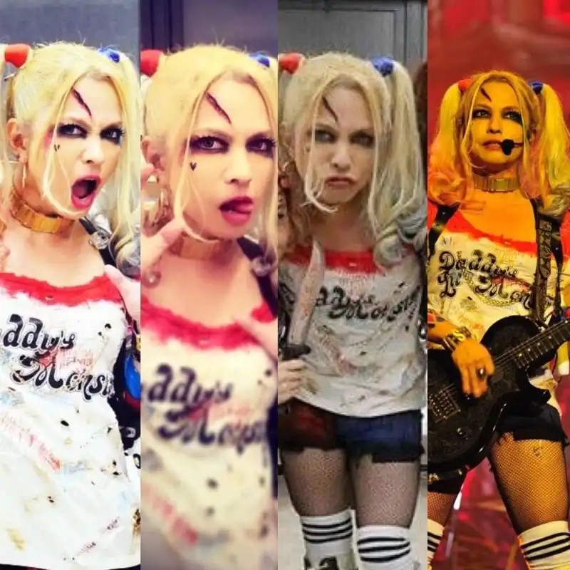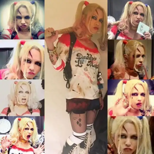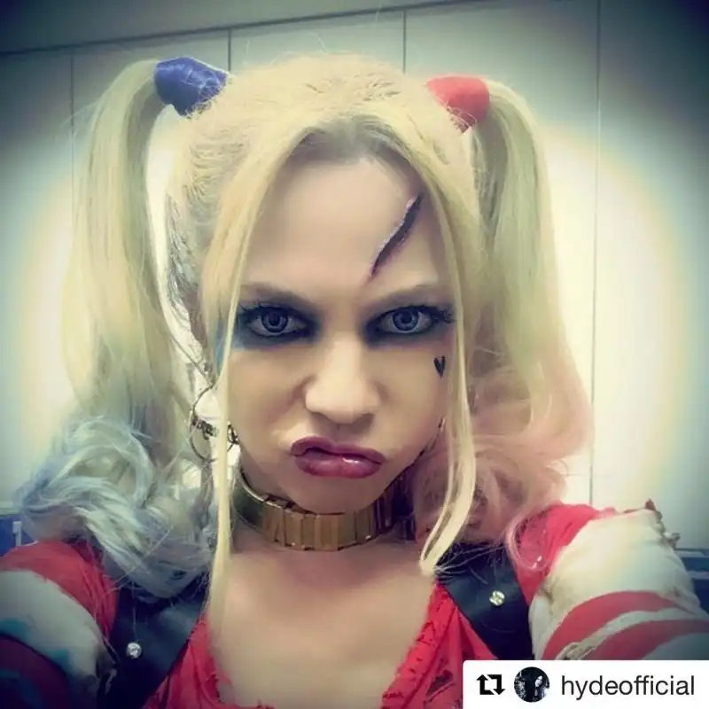 Знаменитости каждый год пытаются придумать что-нибудь эдакое и нарядится неожиданно для своих фанатов. Ничего толкового в 2016 году я не увидел, кроме одного варианта - костюма Харли Квинн из "Отряда самоубийц" на лидере японской рок-группы.