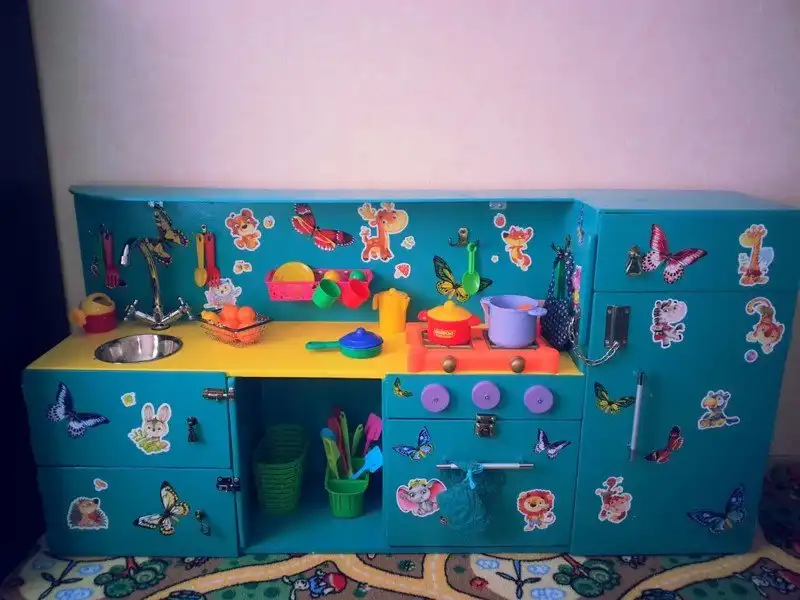 У моей дочки подобная кухня игрушечная, но только покупная. Цены необыкновенной! Игры хватило на неделю, потом интерес к игрушечной кухне был потерян... Увы, но настоящая кухня дочку больше заинтересовала.