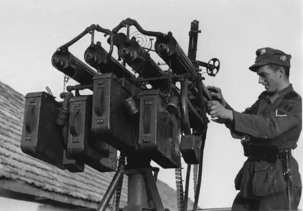 Британский солдат у пулемета Льюиса,установленного на зенитную стойку.1940 год