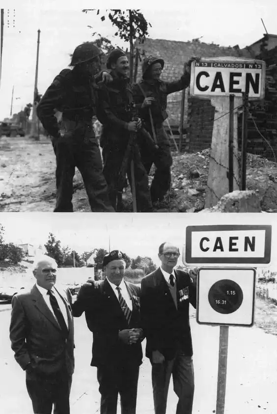 Бойцы полка Королевских Виннипегских стрелков Бернар Ху, Джон МакКоувиль, Джей Костик у знака на въезде в Кан. 11 июля 1944 г. и 44 года спустя.