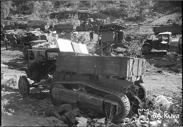 Разгромленная советская автоколонна. На переднем плане ЗСУ со счетверенными Максимами на базе ГАЗ-60. Судя по логотипу финского фотоархива в углу, действо происходит где-то в Карелии.
