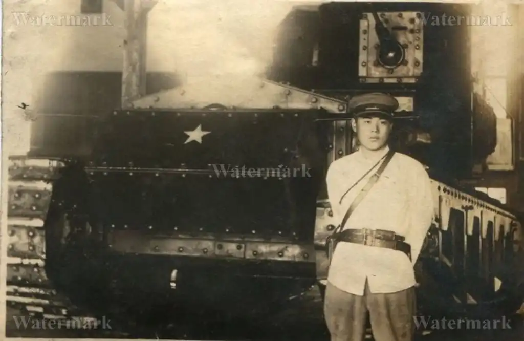 Японский солдат на фоне приобретенного в Британии танка "Уиппет".