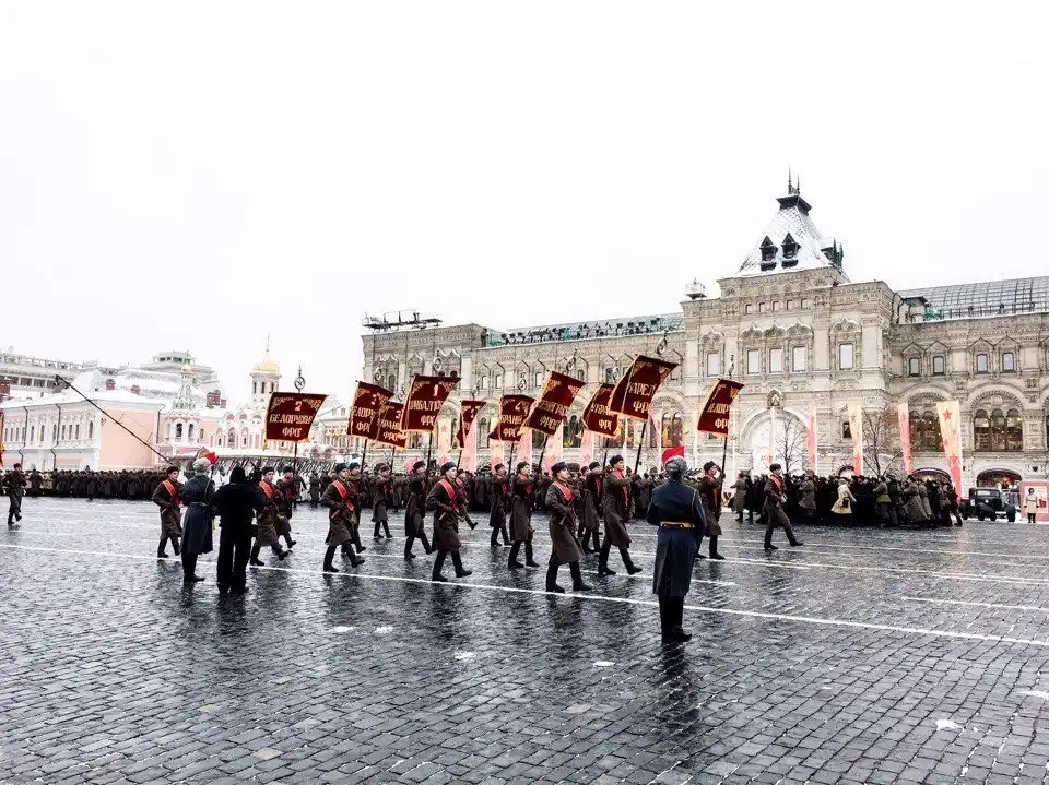Традиция проводить военное шествие 7 ноября появилась в начале 2000-х годов. Тогда в шествии принимали участие кадеты и суворовцы, военно-патриотические организации, рота почетного караула и военный оркестр. Сегодня все участники торжественного парада прошли по брусчатке, облачившись в форму 40-х годов.