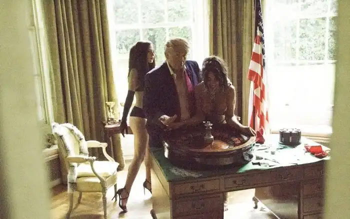 Художник и фотограф Элисон Джексон (Alison Jackson) сделала серию пародийных снимков с двойником Дональда Трампа, чтобы показать, каким, по ее мнению, может стать овальный кабинет Белого дома, когда новый президент вступит в должность. На фото двойник Трампа развлекается с девушками, употребляет алкоголь, сорит деньгами, примеряет военную форму и с помощью помощницы наносит свой знаменитый оранжевый загар.