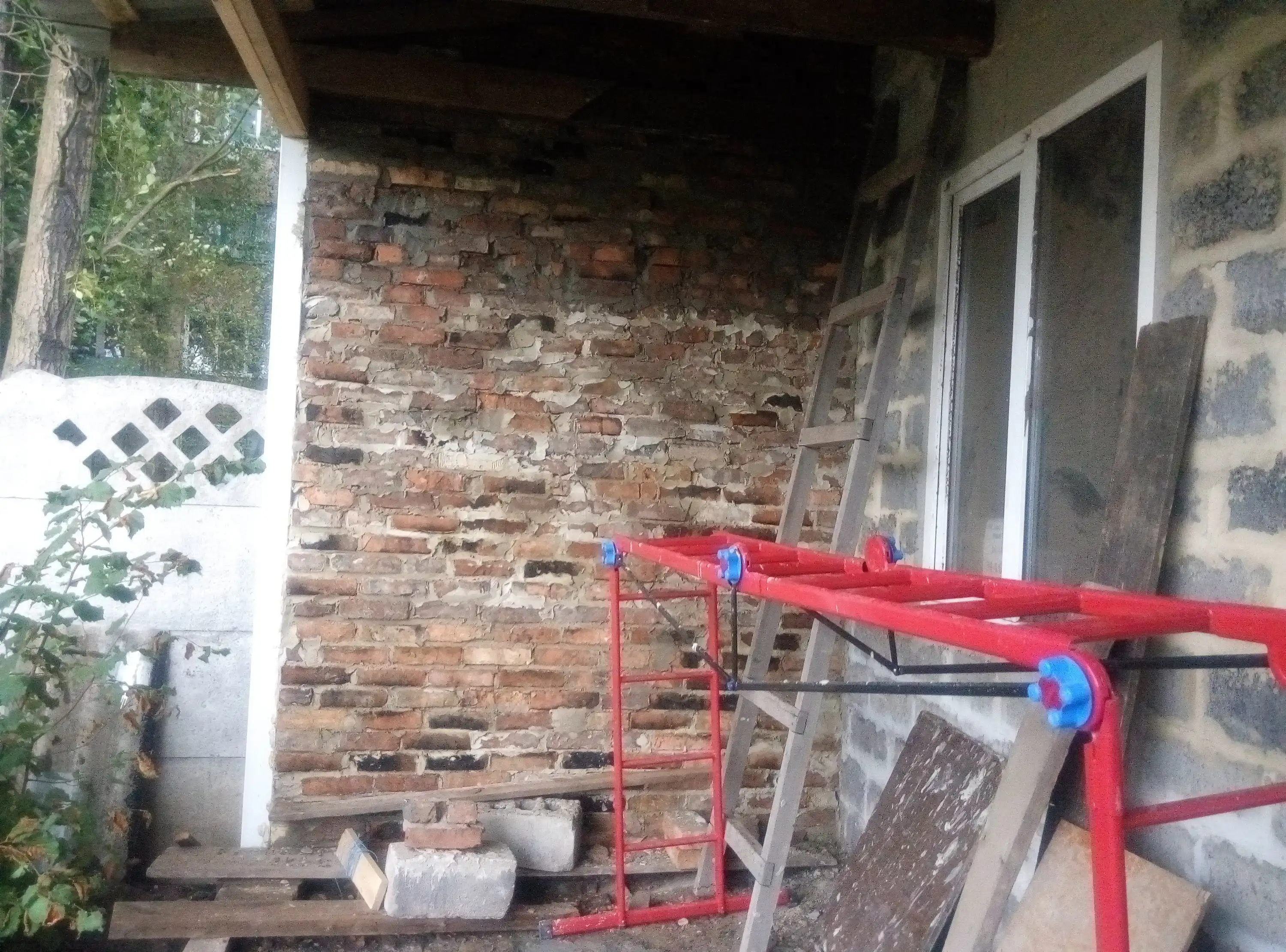 Случайным образом на стройке появилась лестница. Дивная штука! Цена всего 40$, а трансформируется во что угодно. Можно стремянку, можно леса, можно просто лестница 4,8м высоток. Очень выручает.