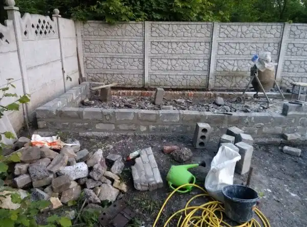 Отковыриваю бетониты от старого разваленного сарая, того что на фото слева. Ложу первый ряд.