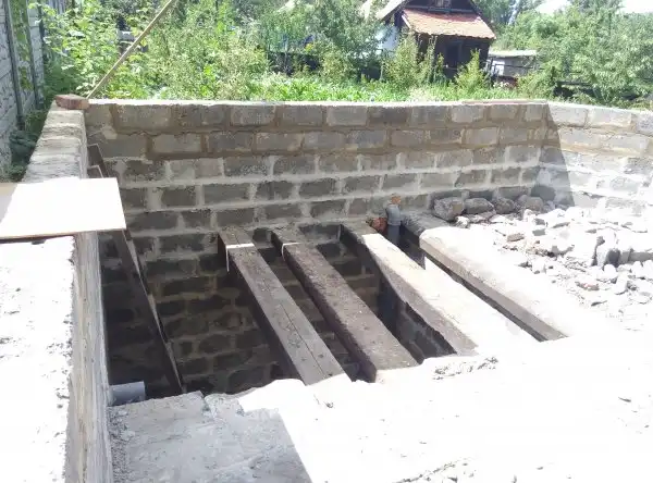Купил за недорого десяток БУшных деревянных шлал с железной дороги. Вложил их в кладку. Они одновременно будут и потолком для погреба и полом для аппендикса.