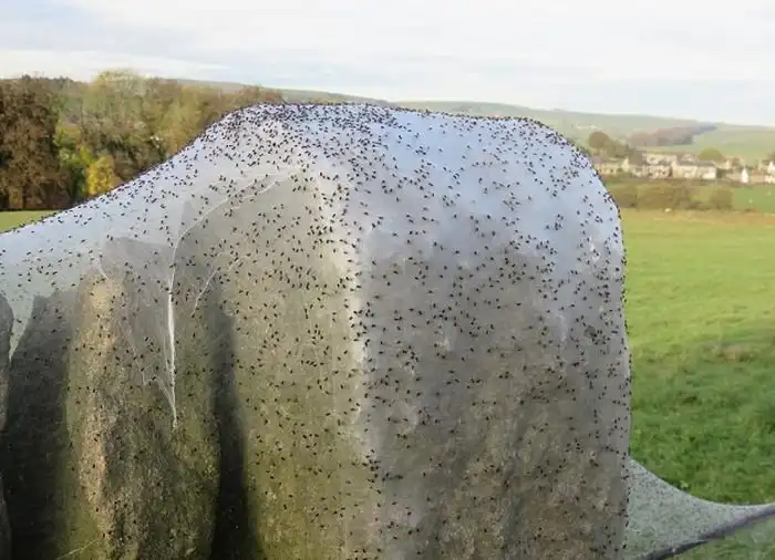 Британская деревня Трауден, что находится на востоке графства Ланкашир, переживает нашествие пауков. Всего за одну ночь пауки обволокли своей паутиной забор местной овцефермы, а теперь на паутине можно найти тысячи маленьких пауков. По словам специалистов, осень в данном регионе выдалась очень теплой, поэтому пауки до последнего момента откладывали выведение потомства.