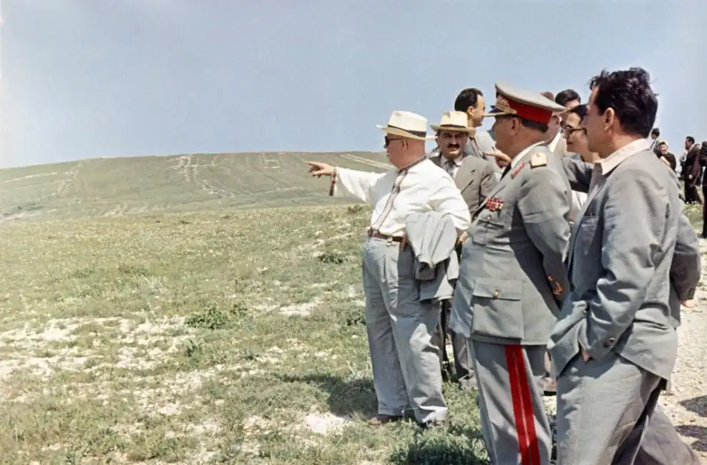 Ещё недавно считавшегося "главарём фашистской клики" Иосипа Тито снова гостепреимно встречали на советской земле. Хрущёв и Тито во время визита последнего в СССР, фото Д. Бальтерманца, 1956 год: