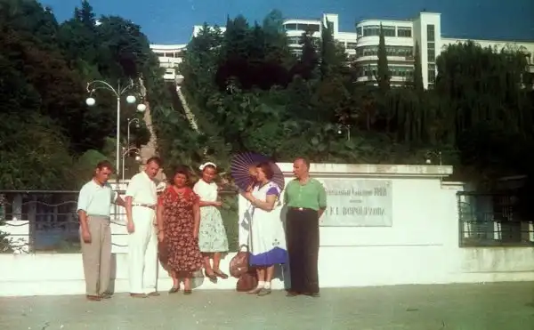 Отдыхающие у санатория Ворошилова (г. Сочи), на слайде военного моряка Виктора Трофимовича Лаптева, 1956 г.: