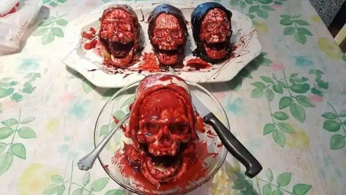 Кулинар, известный под ником Tye Rannosaurus, живет в Голливуде и очень любит фильмы ужасов. Эта любовь обусловила занятие парня, который готовит необычные торты, выполненные в форме окровавленных черепов. Несмотря на то, что подобный десерт выглядит довольно жутко, он полностью съедобен и, наверняка, очень вкусен.