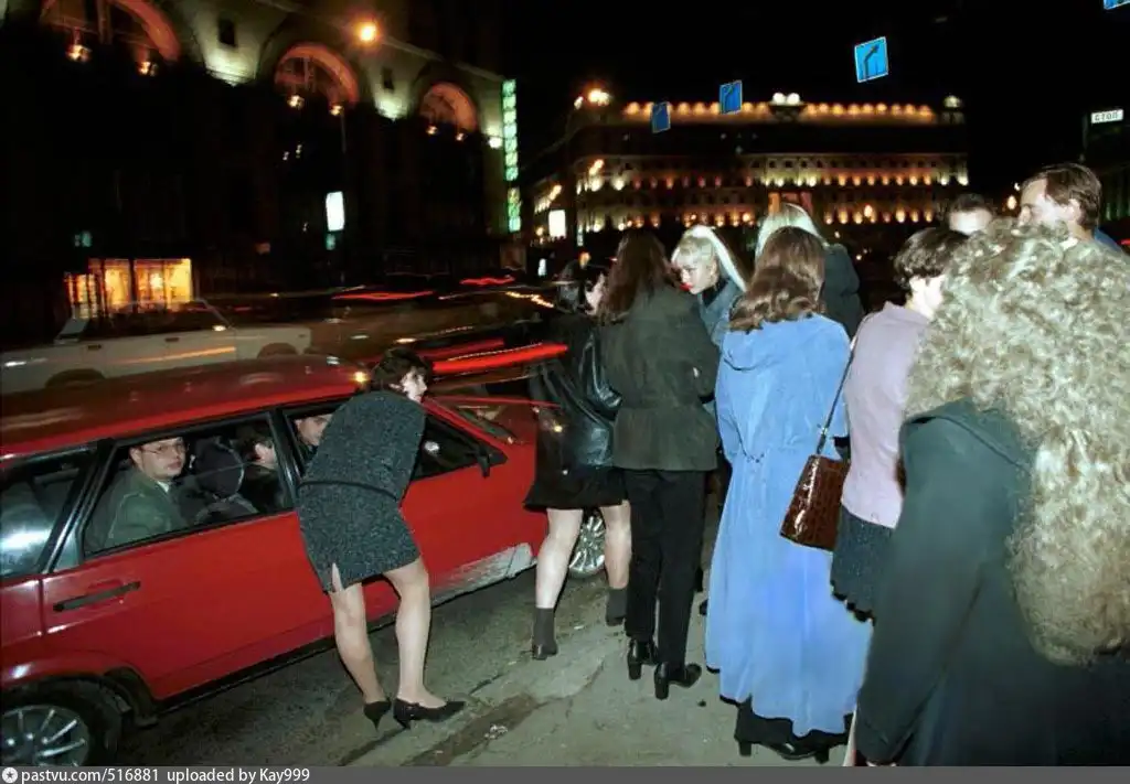Москва... 1994 год. Милиционер проводит воспитательную беседу с девушкой, предварительно поставив ее сутенеров (слева) лицом к витринам киосков на ночной Тверской улице.