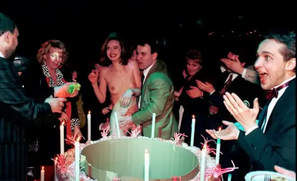 Торт со стриптизершей: московские предприниматели празднуют день рождения коллеги в одном из многочисленных клубов в 1996 году. Момент *доставания* девушки из торта