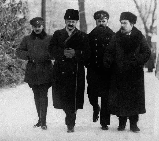 Члены российской делегации Лев Каменев, Василий Альтфатер и Лев Троцкий (справа налево) на переговорах в Брест-Литовске, февраль 1918 года:
