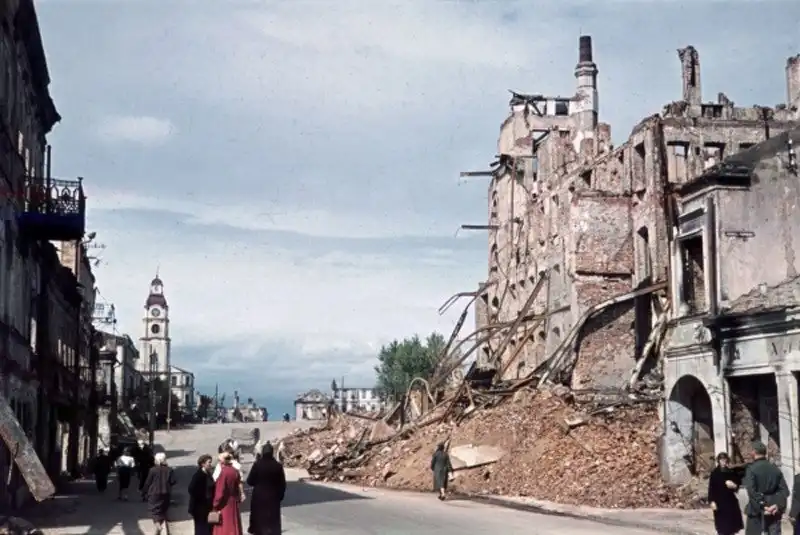 Справа руины гостиницы "Европейская" (восстановлена в 2000е), в перспективе — башня иезуитского коллегиума, снесённая в 1950-е. Очень хотелось сделать фотосравнение для наглядности, но в Панорамио так и не смог найти подходящего современного снимка.