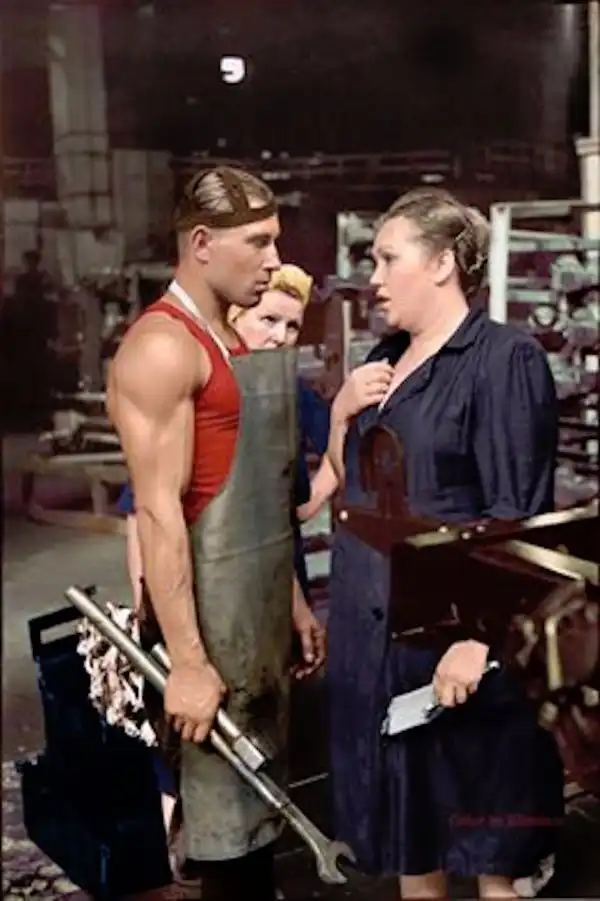 Рабочий и начальница на АЗЛК (тогда «Московский завод малолитражных автомобилей» (МЗМА) в 1954 году. Раскрашенный снимок великого Анри Картье-Брессона.