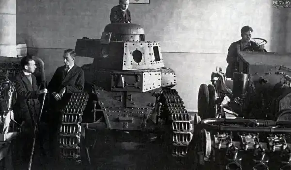 Группа студентов Автодорожного института знакомится с устройством танков и тракторов. Ленинград. РСФСР. СССР. 1934 год: