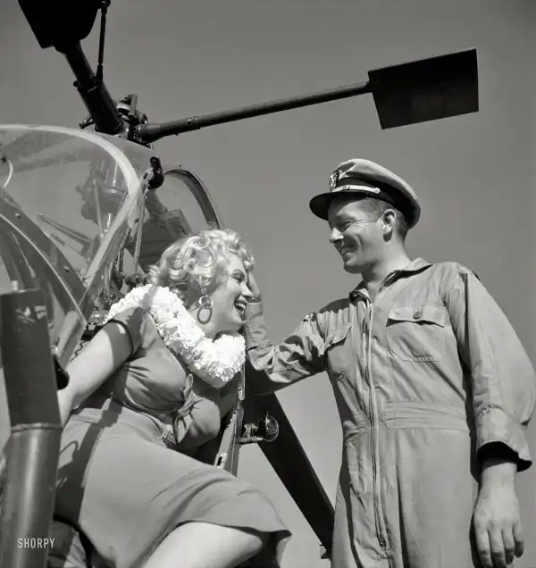Мэрилин Монро и пилот US Navy возле вертолета; фото Charlotte Brooks, 1952 год: