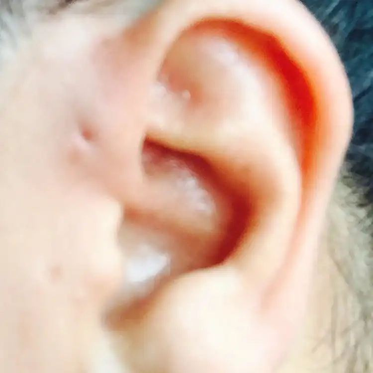 Отверстия обычно появляются в точке, где ушной хрящ соединяется с лицом и могут выглядеть как «узелки, вмятины и углубления».