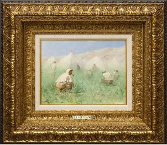 Перед вами картина русского художника Василия Васильевича Верещагина «Русский лагерь в Туркестане», которая выставлена на аукцион и оценивается примерно в 160 000 долларов. Картина написана маслом на холсте в 1870 году и на ней изображена одна из бытовых сцен. Верещагин принимал участие в военных кампаниях, так как был художником-баталистом, только далеко не всегда он изображал битвы.