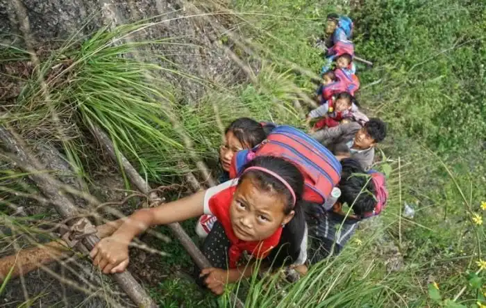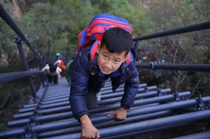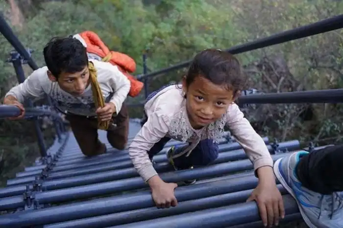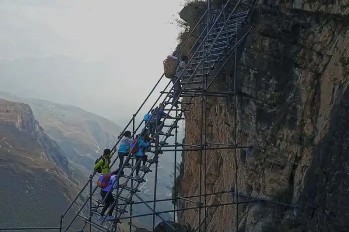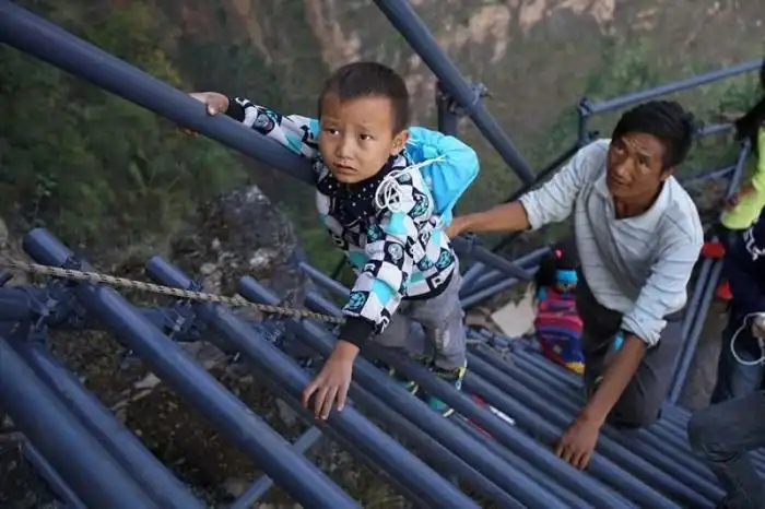 Власти Китая построили надежную железную лестницу в горах небольшой деревушки, детям которой постоянно приходилось карабкаться в гору по ветхим деревянным лестницам, чтобы попасть в школу. Металлическая конструкция значительно облегчила 800-метровый горный переход, сделав дорогу в школу более безопасной.
