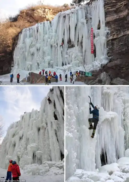 Экстремально холодная зима 2014 года вызвала хаос по всему миру, однако в Китае она обеспечила веселое времяпровождение для местных экстремалов. В пекинском уезде Миюнь было так холодно, что местный водопад полностью замерз. Невероятное зрелище привлекло десятки альпинистов, которые, вооружившись кошками и кирками, решили покорить огромный водопад.
