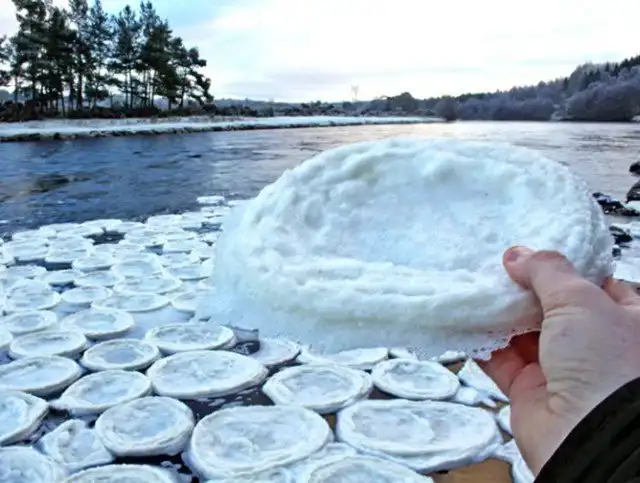 Эти пушистые диски могут выглядеть как блины, но сметаны к ним добавлять явно не стоит. Флотилия таинственных блиноподобных дисков была замечена в 2014 году, когда они дрейфовали вниз по реке Ди в Абердиншире, Шотландия. При более близком изучении оказалось, что «блинчики» сделаны из замороженного льда и пены. Ученые считают, что кусочки замороженной пены попали в водоворот, где они кружились до тех пор, пока не приобрели дискообразную форму.