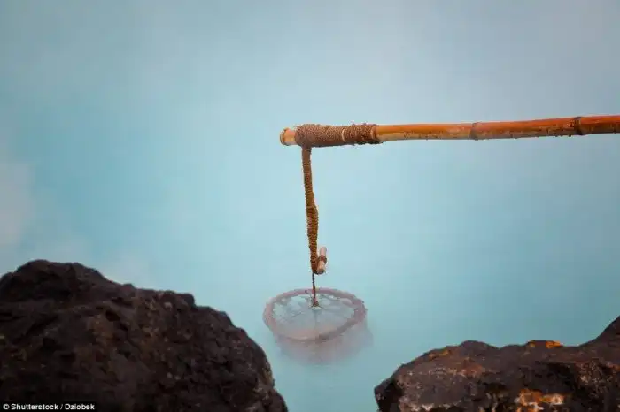 Корзинка с яйцами, погруженная в геотермальный источник Sea Hell.