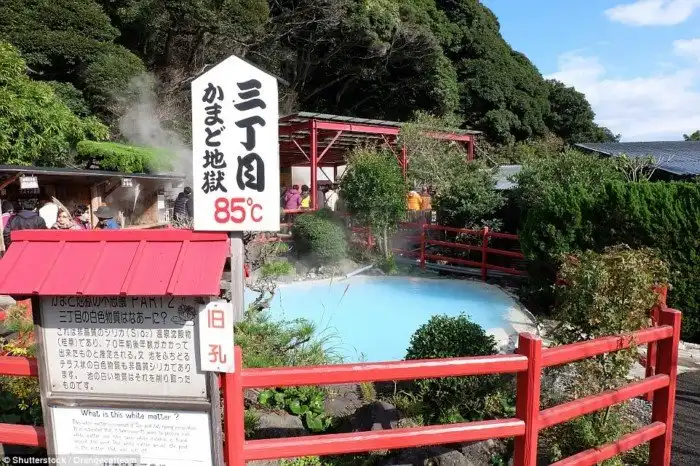 Этот геотермальный источник называется White Pond Hell. Он окружен прекрасным садом, а рядом с ним находится небольшой аквариум.