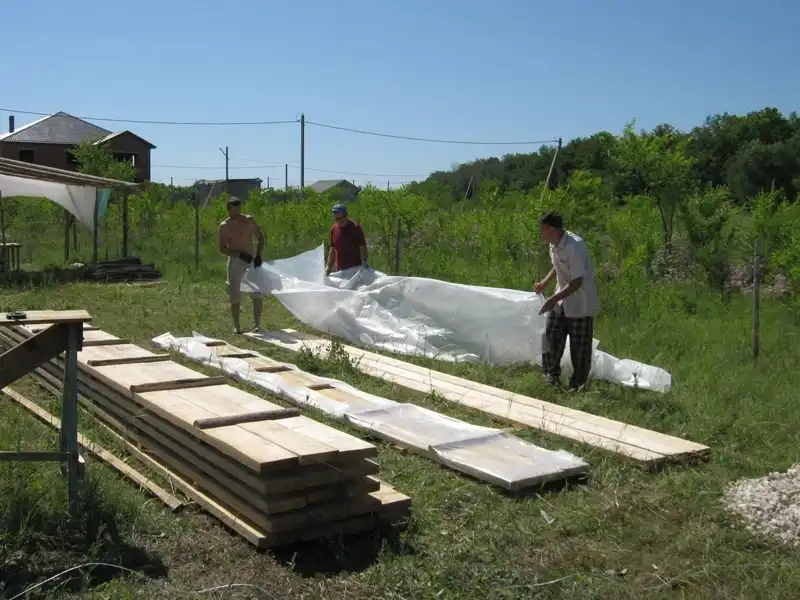 Сколоченные щиты обматыва... оборачиваем полиэтиленом, чтобы потом не мыть их два месяца.