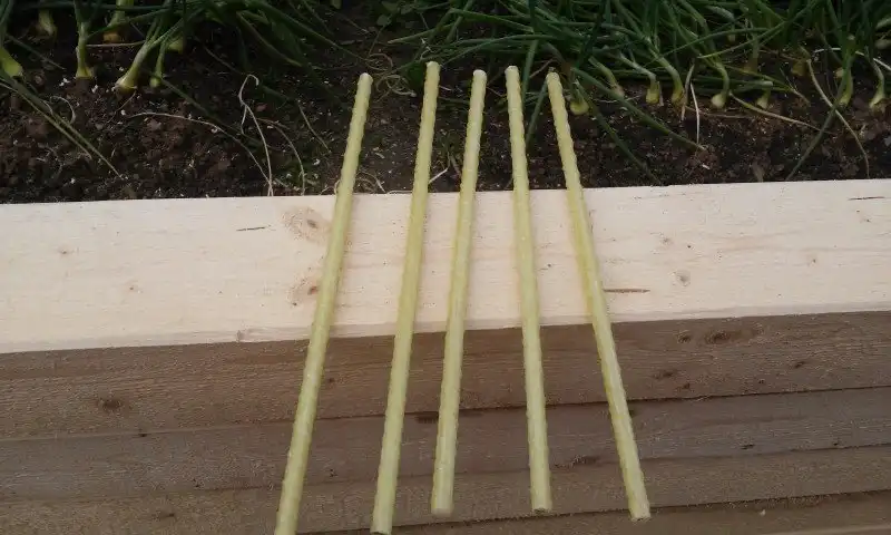 Крепим на пластиковую арматуру, заранее нарезал болгаркой в размер. Крепим в шахматном порядке. Сверлим по три бруса насквозь, в четвертом до половины и забиваем до упора нагель.