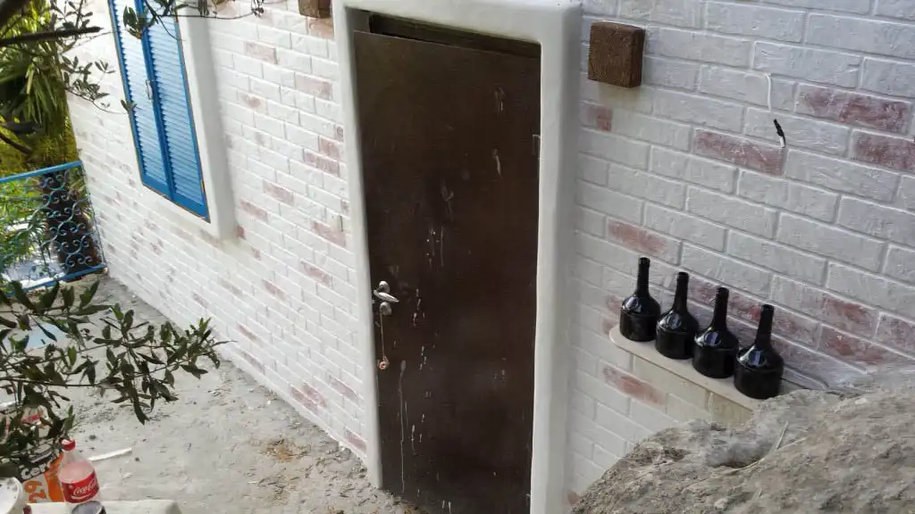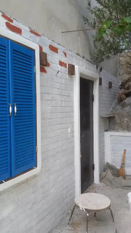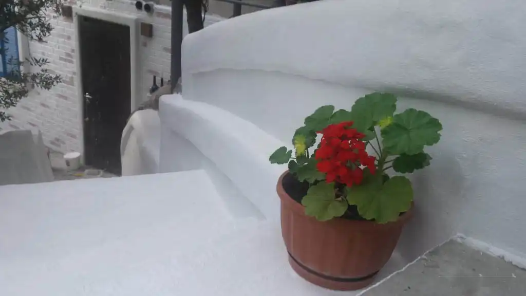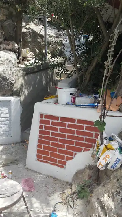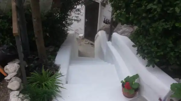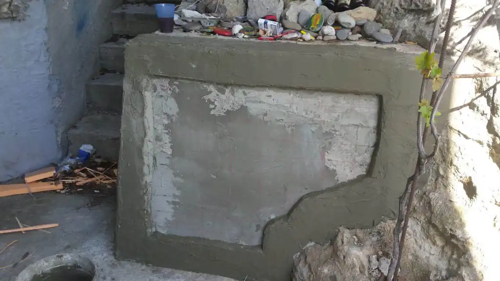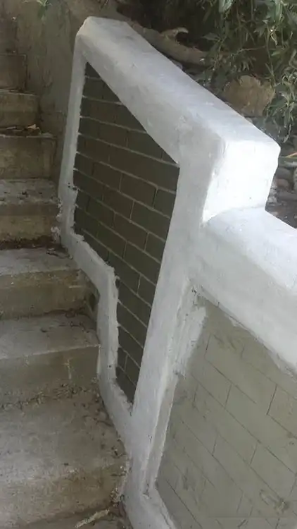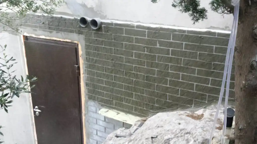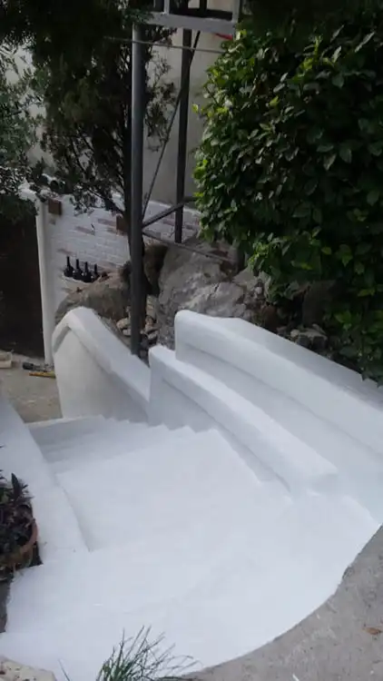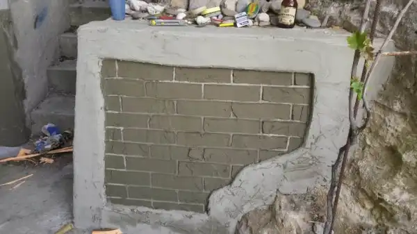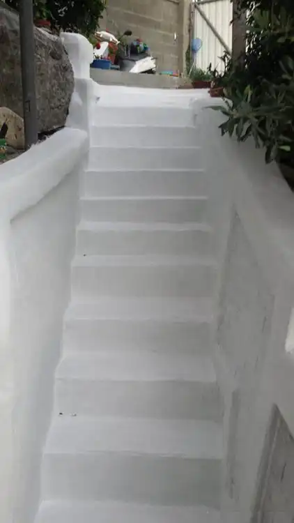 Ничего не отпадет, клей затем штукатурка СТ 29 для наружных работ.гидроизоляция, СТ116 и еще краска на стенах латексная, а на ступенях палубная для кораблей.