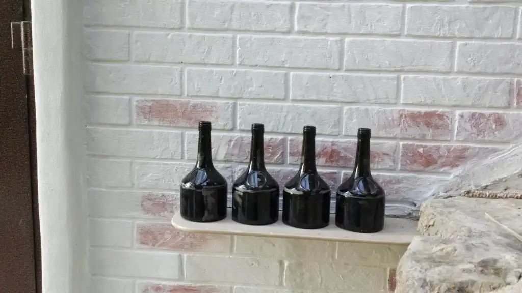 Затем пробил водяным уровнем, расчертил стену, сделал лекало и нарисовал кирпичи. Прогрунтовал. Купил малярный скотч 19 мм. Разрезал вдоль. Приклеил его по контурам кирпича.