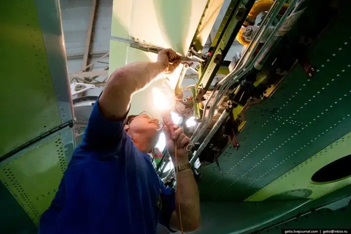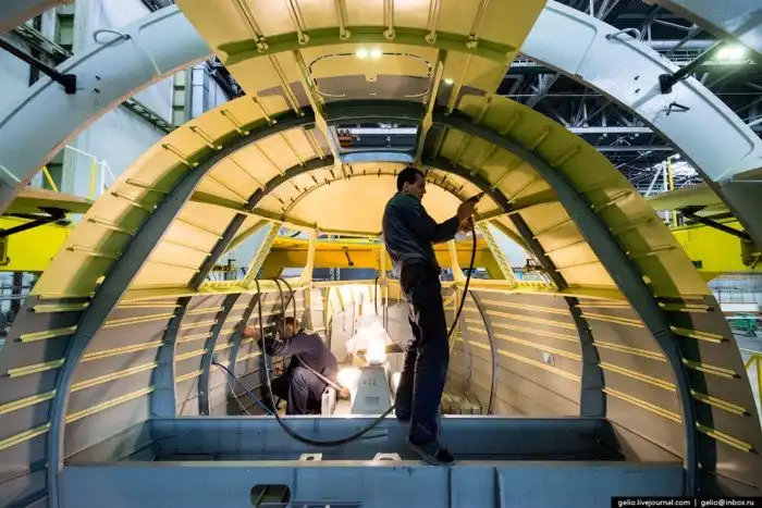 На фото: изготовление отсеков фюзеляжа Ф-1 и Ф-2 (носового и центрального) первого опытного образца Ил-112В в агрегатно-сборочном цехе ВАСО.