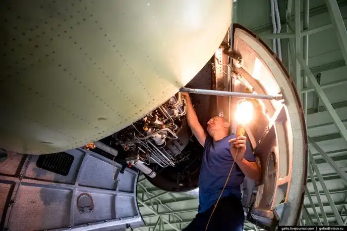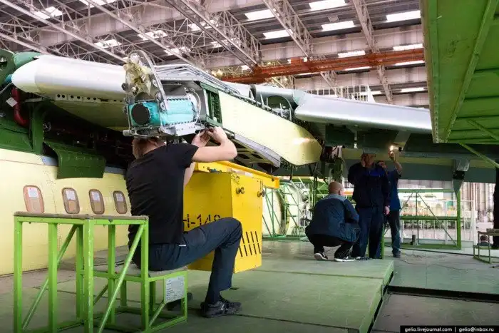 В ходе монтажа крыла используют весовые макеты силовой установки. Масса жёлтого куба — около 1400 кг, что соответствует массе газотурбинного двигателя Д-436-148.