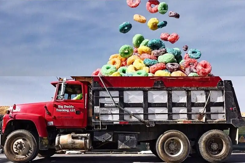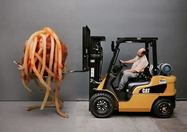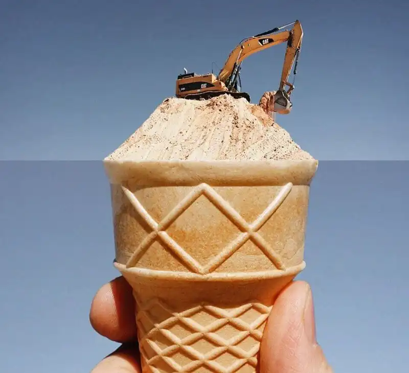 Сюрреалистические кадры включают лыжника на вершине мороженого, и макароны и тефтели на ковше погрузчика, экскаватор черпает из мороженого, и вишневый шар для боулинга