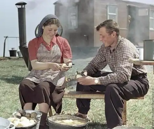 Целинники готовят обед у полевой кухни, 1 мая 1955.