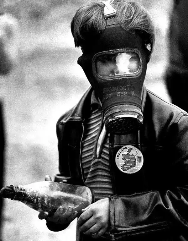 Ирландский мальчик в противогазе с коктейлем молотова участвует в Битве за Богсайд, Дерри, Северная Ирландия, 1969 год.