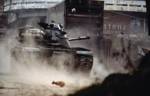 Кот перебегает через улицу во время уличного боя в Бейруте, Ливан, 1980-е.