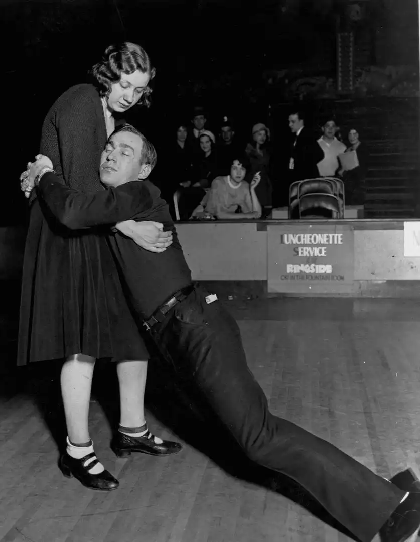 Женщина поддерживает своего обессилевшего партнера во время танцевального марафона. Чикаго, 1930 год.