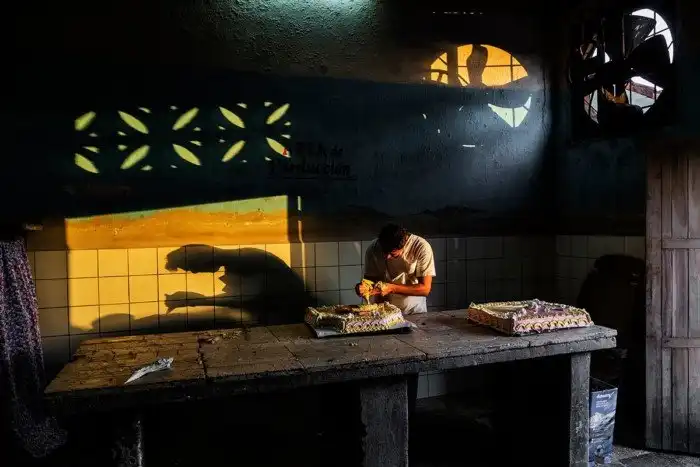 Джереми Вудхаус, Великобритания. Высокая оценка, «Светотень». Кондитер в Виньялесе, Куба, покрывает торт глазурью в лучах заката, проникающих в дверной проем.