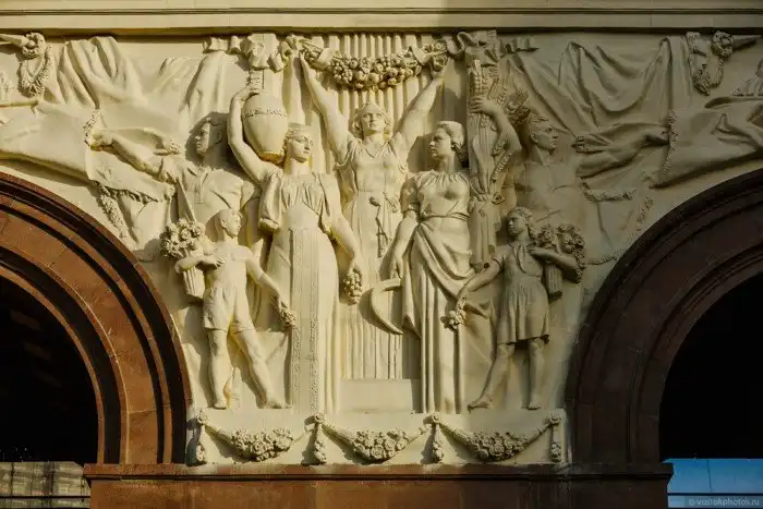 Пять нижних этажей сталинской высотки облицованы гранитом и образуют монументальный цоколь. Все архитектурные элементы, скульптурные группы и обелиски проходят процесс реставрации.